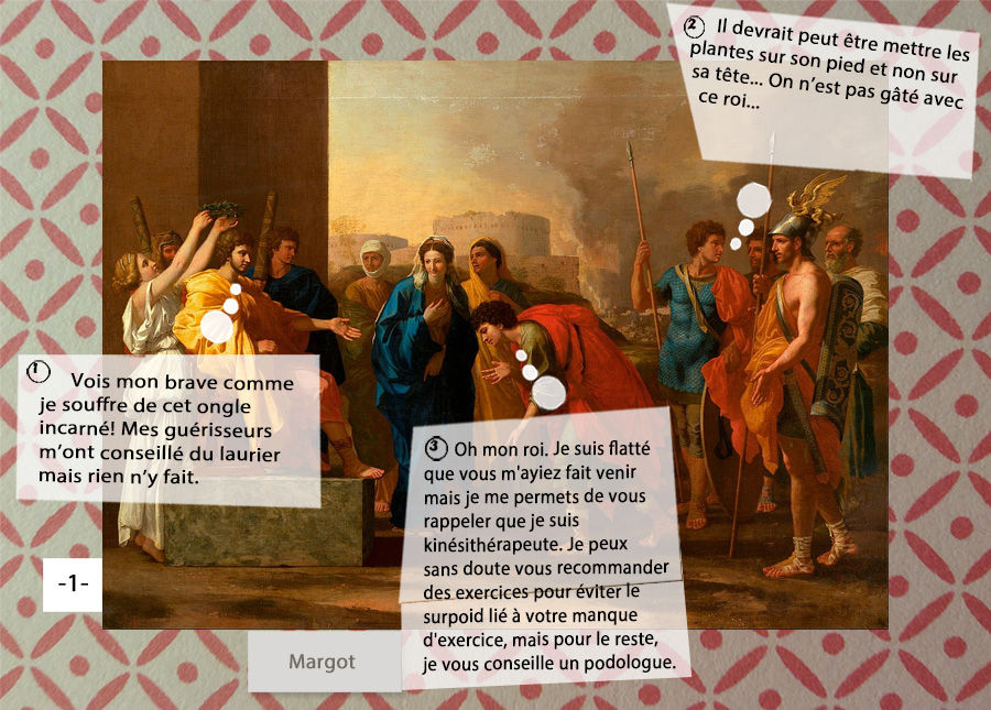 Imaginez les textes qui pourraient surgir à l'intérieur des bulles placées dans le document ci-dessous, en prenant en compte les caractéristiques de l'œuvre.